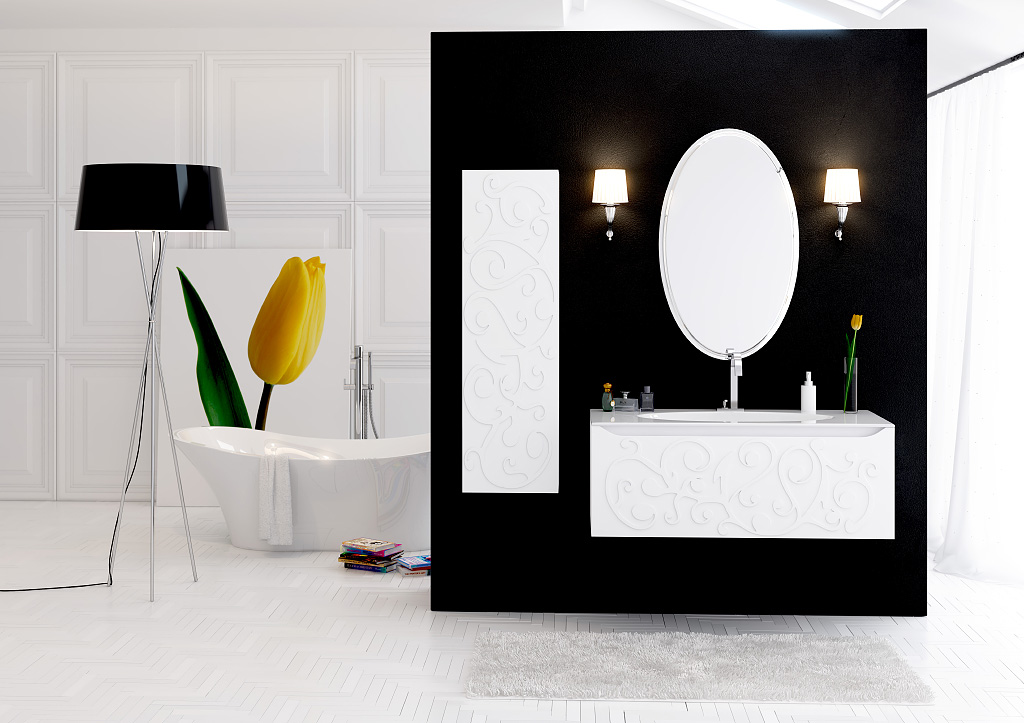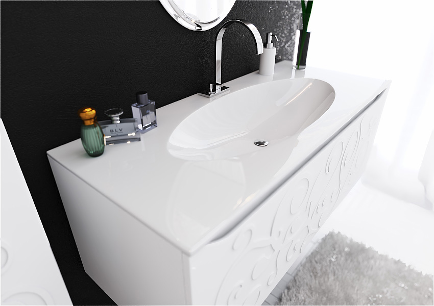 • Модель также может комплектоваться зеркальными шкафами в размерах 100 и 120 см, отличительными особенностями которых являются: сенсорный выключатель, реагирующий на движение рукой в нижней части шкафа; фоновое освещение зеркального полотна по периметру. В качестве основного источника света используется LED-светильник в металлическом корпусе.